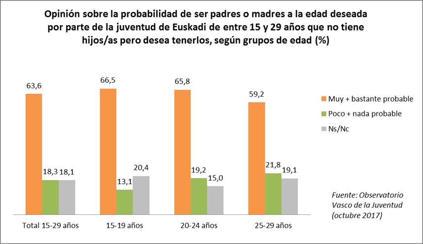 El 63,6 % de las personas que desean tener hijos o hijas creen que es muy o bastante probable que los tengan a la edad que desean; por el contrario, el 18,3 % cree que es poco o nada probable tenerlos a la edad que considera la ideal para ello, y el 18,1 % restante no sabe o no contesta.