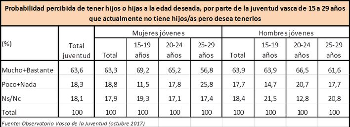 Apenas hay diferencias entre chicos y chicas en cuanto a las probabilidades percibidas de ser padres o madres a la edad deseada. Sin embargo, a medida que aumenta la edad y se acerca, por tanto, la edad considerada ideal para ser padres o madres, desciende el porcentaje de jóvenes que creen probable tener hijos o hijas a esa edad ideal y, por contrario, asciende el de quienes lo consideran improbable. En cualquier caso, son más quienes piensan que tendrán los hijos o hijas a la edad deseada que quienes creen que tendrán que retrasar su maternidad o paternidad.
